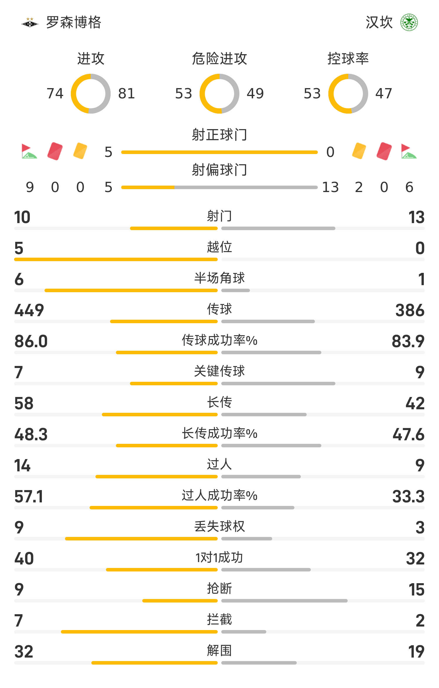 全场比赛结束,罗森博格主场2-0战胜汉坎。